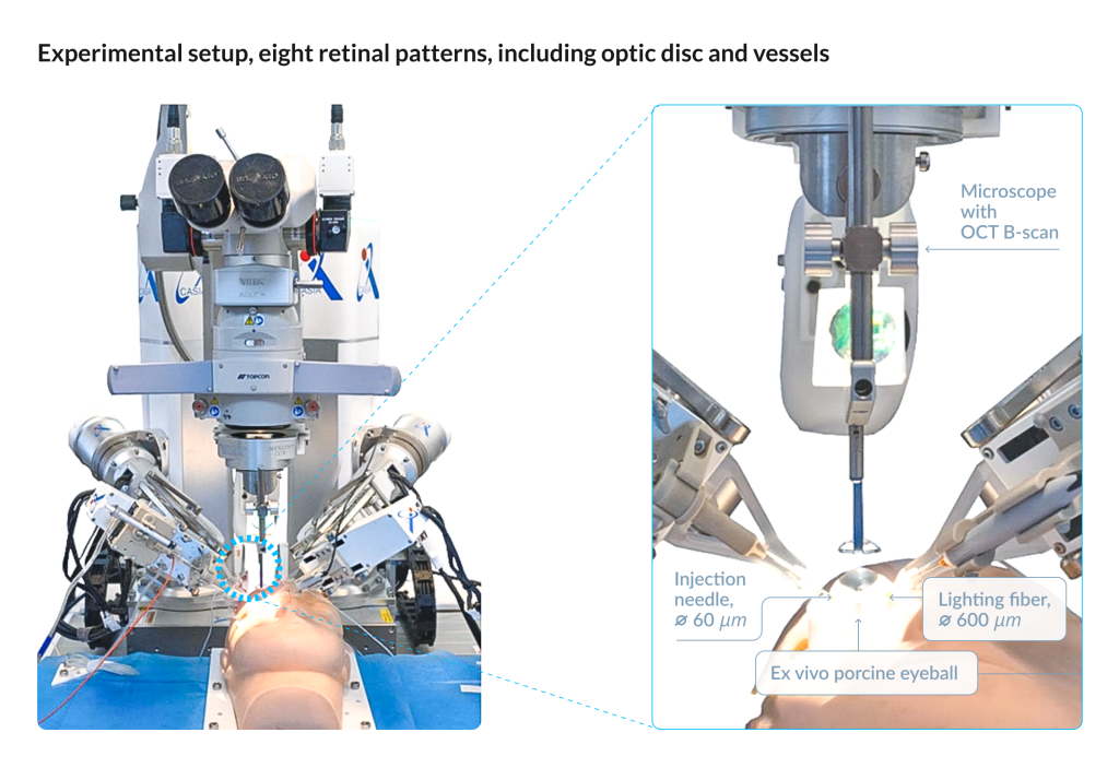 The procedure begins with the surgeon defining the surgical target — a specific point on the retina or within a vessel. From there, the robot proceeds autonomously: entering through the trocar, identifying the operative field, calibrating its position, advancing the needle, and performing puncture and injection along a planned trajectory. During the procedure, the system continuously monitors forces at the needle tip, visual indicators of tissue penetration, and depth limits. It also generates alerts in response to atypical tissue behavior, allowing the surgeon to assume immediate control if necessary.