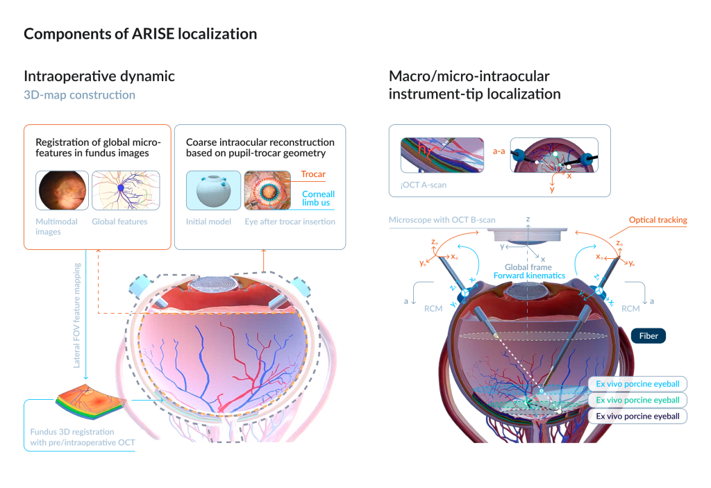 ARISE is a dual-manipulator microsurgical robot. The right manipulator holds an injection needle equipped with force and distance sensing, whereas the left manipulator holds a medical lighting fiber for intraocular illumination. It offers 12 degrees of freedom, micron-level positioning accuracy, and an integrated navigation and safety control system. The platform constructs a dynamic three-dimensional model of the eye by integrating data from the surgical microscope, preoperative and intraoperative optical coherence tomography (OCT), optical tracking systems, and onboard position sensors.