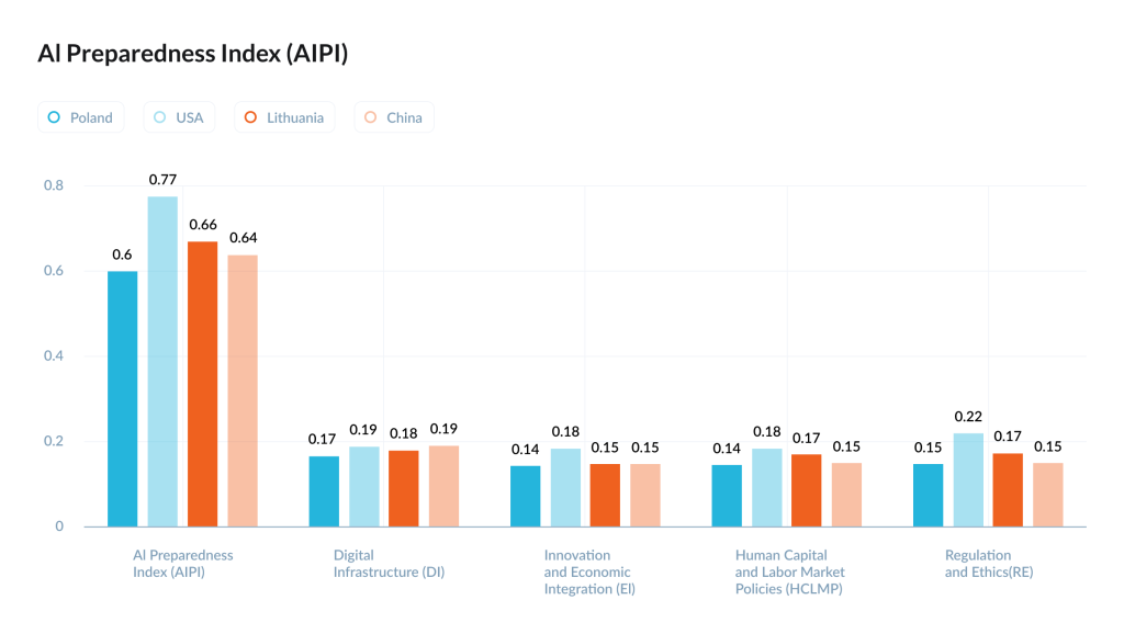 Alexander: When studying AIPI, it is essential to remember that it is the sum of four sub-indices (DI + IEI + HCLMP + RE). For example, the rating for the United States is 0.7713, for Lithuania it is 0.6649, and for China it is 0.6355. However, this is not about one magical number, but rather about which specific sub-indices have advantages and what they ultimately yield. Here, an important observation emerges: in terms of digital infrastructure (DI), the gap is not as dramatic — China is at 0.1901, the U.S. at 0.1878, Lithuania at 0.1774, and Poland at 0.1655. Thus, “internet and data centers” alone do not explain why the U.S. is pulling ahead; the decisive difference accumulates in the other blocks.